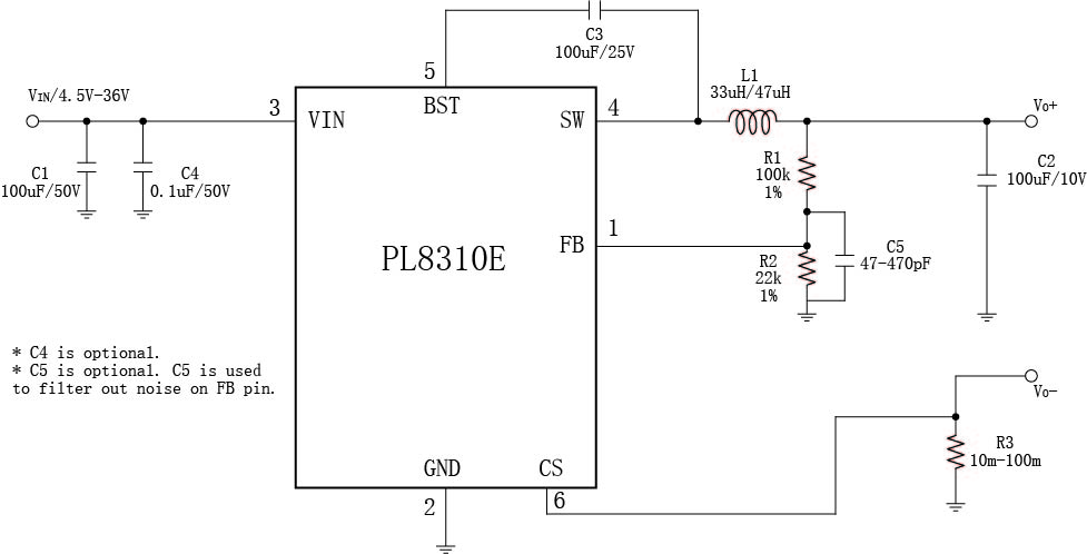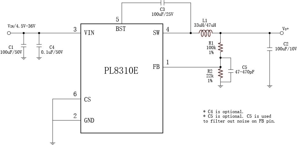 PL8310E是一款单片36V、1A降压型开关稳压器。PL8310E集成了一个36V 250mΩ高侧和一个36V 140mΩ低侧MOSFET,可在4.5V至36V宽工作输入电压下提供1A连续负载电流,并具有33V输入过压保护。峰值电流模式控制提供快速瞬态响应和逐周期电流限制。