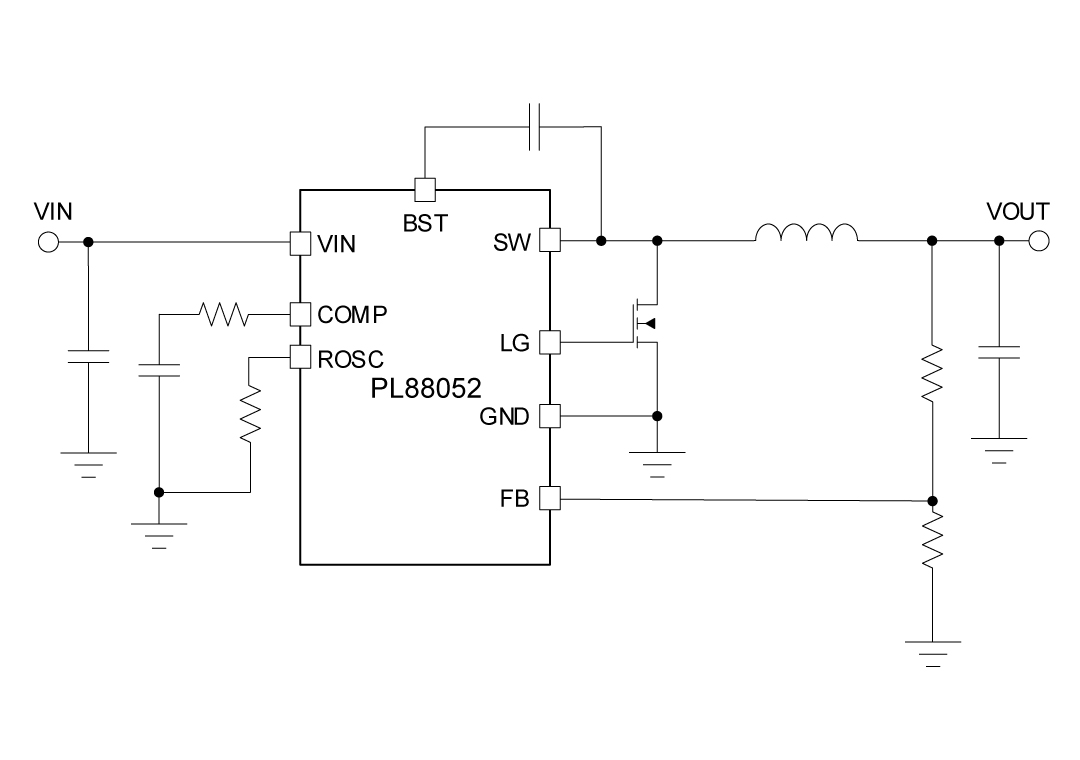 PL88052 的其他特点包括超低静态电流和高轻负载效率、创新的峰值电流保护、集成的 VCC 偏置电源和引导二极管、精确的使能和输入欠压锁定 (UVLO),以及自动恢复的热关断保护。
