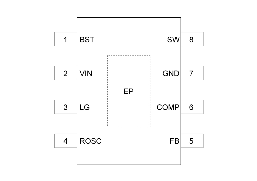 | 9 | EP | 封装的裸露垫片。没有内部电连接。将EP焊接到GND引脚并连接到大型铜面以降低热阻。 |