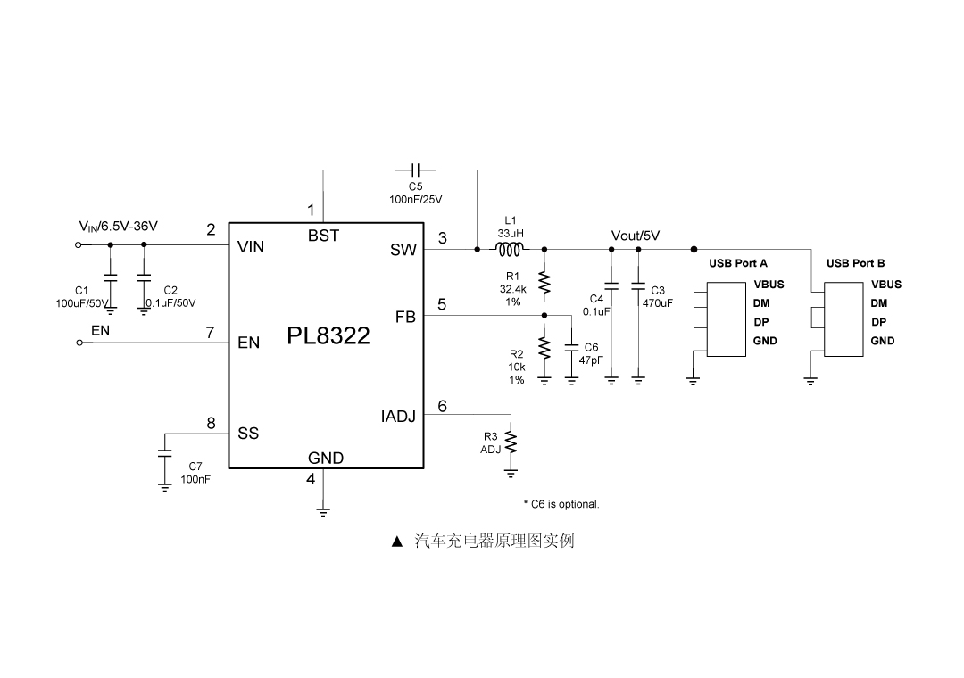 PL8322集成了高效率的同步降压开关功率管,其中包括高侧36V、76mΩ和低侧36V、52mΩ MOSFET,以提供3.1A的连续负载电流,工作输入电压范围为6.5V至30V,并具有33V的输入过压保护。峰值电流模式控制提供快速的瞬态响应和逐周期电流限制。