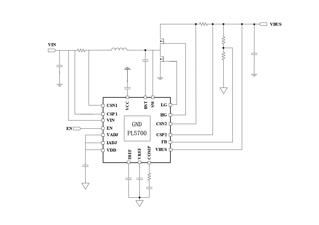 PL5700采用恒定导通时间(COT)控制拓扑结构,能实现快速瞬态响应。其 2A 栅极驱动器可将外部 MOSFET 的功率损耗降至最低,同时允许使用各种标准阈值器件。此外,PL5700 采用脉冲跳跃模式,以提高轻载或空载时的效率。