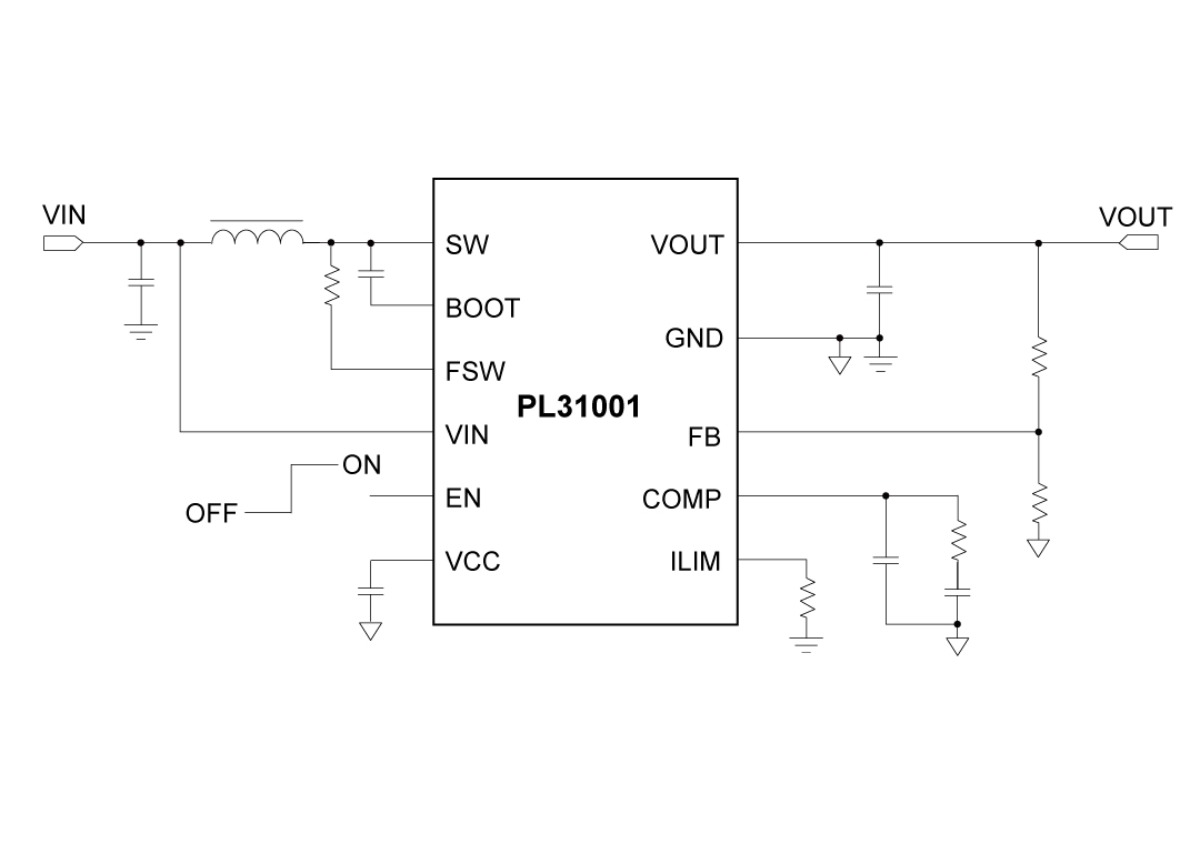 PL31001采用自适应恒定关断时间峰值电流控制拓扑结构调节输出电压。在中等到重负载条件下,PL31001以PWM模式工作。在轻载条件下,PL31001以可提升效率的脉频调制(PFM)模式工作,而PL31001仍以可避免因开关频率较低而引发应用问题的PWM模式工作。PWM模式下的开关频率可在200kHz至2.2MHz范围内调节。