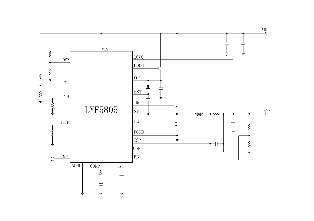 LYF5805是一款100V高压大电流同步降压控制器,专为输入电压高达100V的高性能同步降压DC/DC应用而设计。LYF5805驱动一对外部NMOSFET。开关频率可在50kHz-500kHz范围内编程,从而可以灵活地调整效率和尺寸。对于低电压应用,可以使用内部1.2V参考电压来精确调节输出电压。