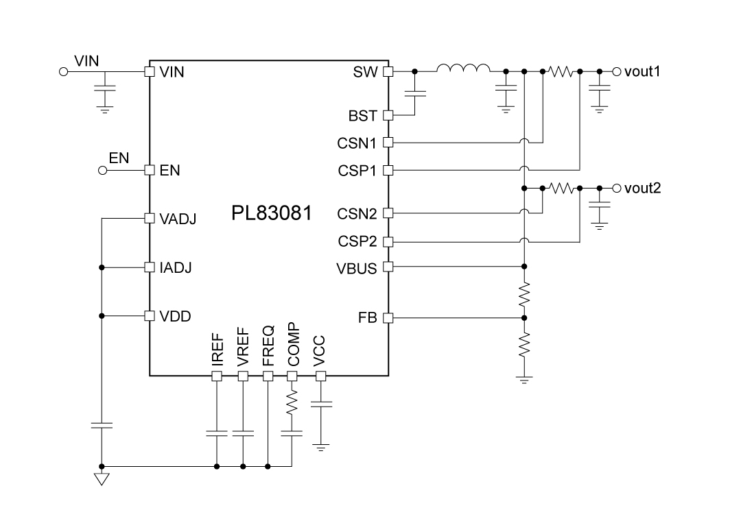 该设备还具有可编程的软启动功能,并提供各种保护特性,包括周期性电流限制、输入欠压锁定(UVLO)、输出过压保护(OVP)、热关断和输出短路保护等。PL83081 提供电压控制回路、恒流回路和热调节回路。