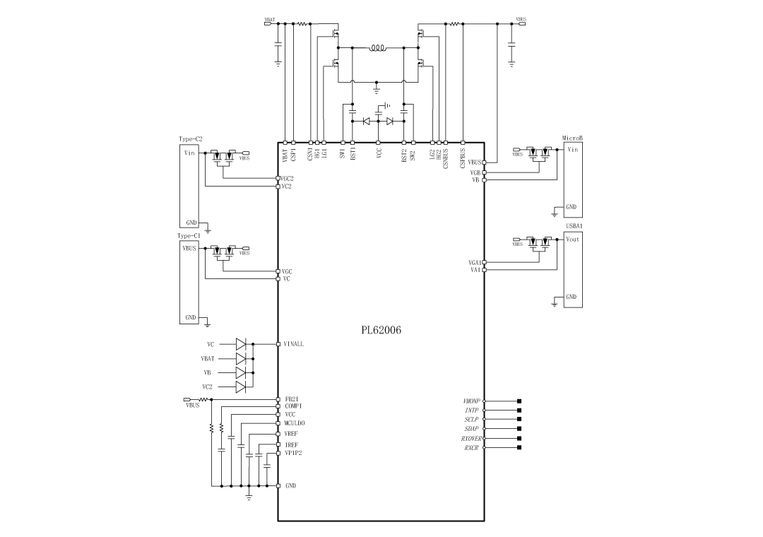 PL62006还提供VMONP引脚,MCU(单片机) 可以通过该引脚实时监控总线、电池电压、总线、电池电流和每个端口的电流。所有这些功能都简化了系统设计,并降低了任何充电系统的BOM成本。PL62006支持欠压保护、过压保护、过流保护、短路保护和过温保护,确保不同异常情况下的系统安全。