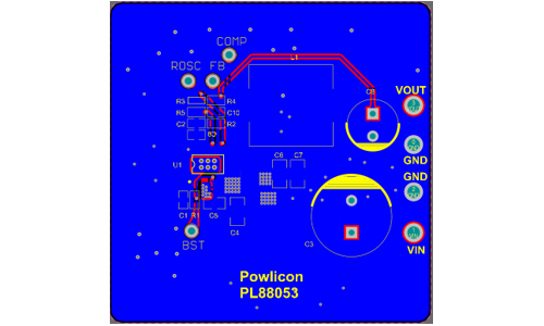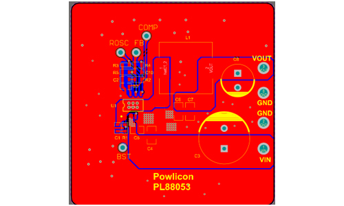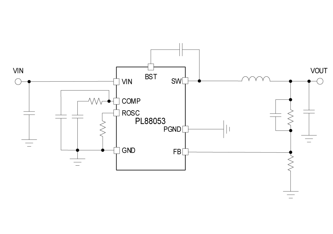 PL88053的其他特点包括超低静态功耗和高效率、创新的峰值电流保护、集成的VCC偏置电源和引导二极管、精密使能和输入欠压锁定(UVLO),以及带自动恢复的热关断保护。