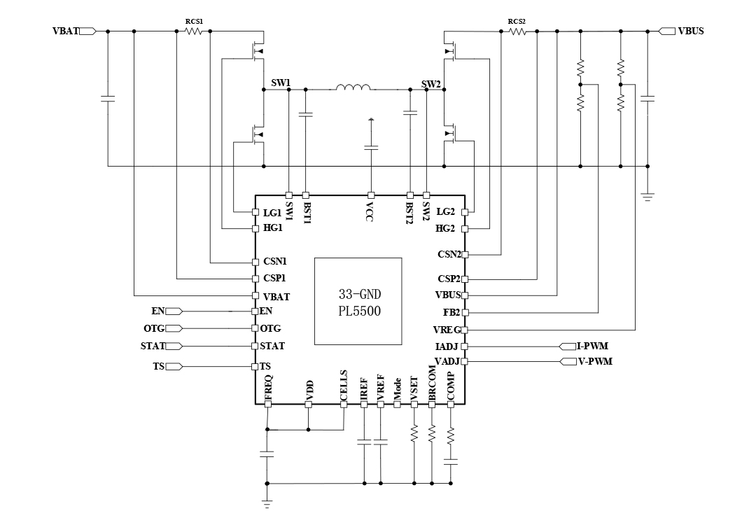 PL5500是一款同步四开关双向降压-升压型控制器,能够调节高于或低于输入电压的输出电压。PL5500 可在 3.6 V 至 32 V(最大 36 V)的宽输入电压范围内工作,支持各种应用。PL5500可在充电器模式下为 1、2、3、4、5 和 6 节电池充电。