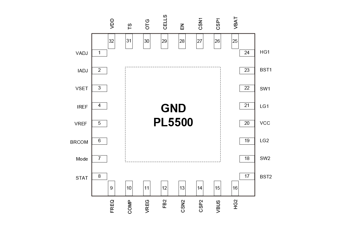 | 32 | VDD | 5.4V电源为PL5500核心电压。 |